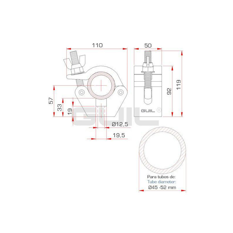 - Grampo projetado para fixação segura em tubos com diâmetro externo de 45 mm a 52 mm.