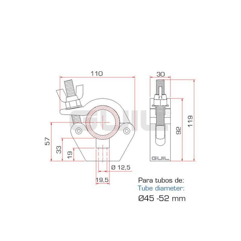 A garra é fornecida com uma braçadeira de alumínio (ref. ABZ-29) para uma fixação segura de tubos ou treliças com um diâmetro externo de 45 mm a 52 mm.