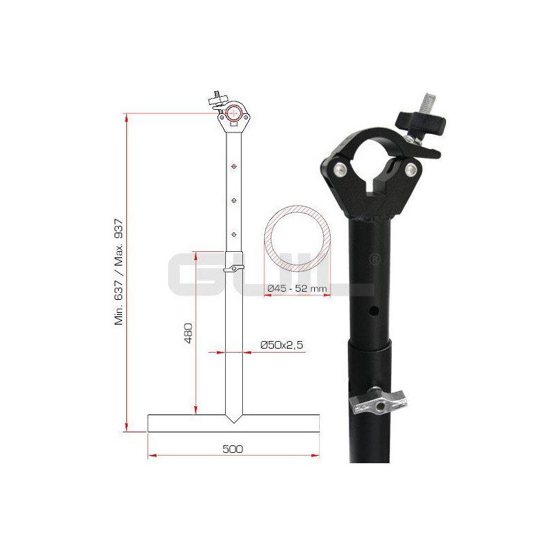 Braço telescópico com design “T” em alumínio (diâmetro do tubo: 50 x 2,5 mm).