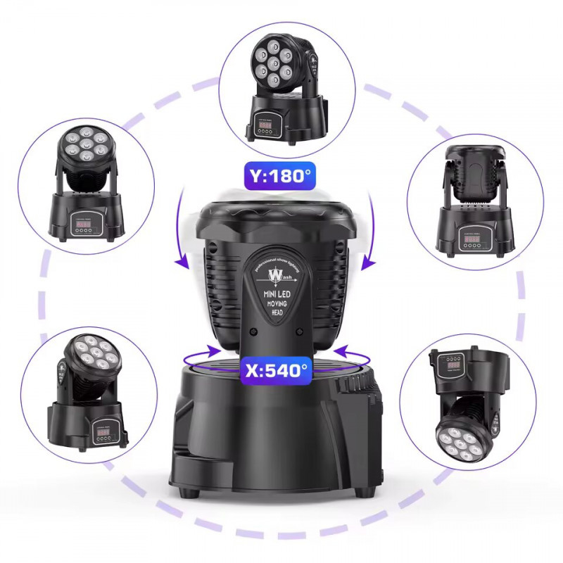 O moving head possui movimento horizontal de 540° e vertical de 180° , garantindo cobertura completa do palco. Seu ângulo de projeção de 15° a 25° permite ajustar a dispersão da luz para efeitos spot ou color wash.