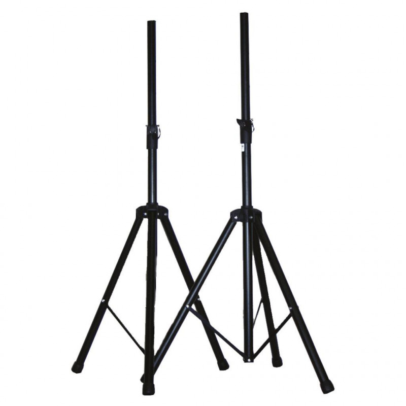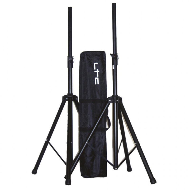 Um par de suportes de alto-falantes ajustáveis com bolsa de armazenamento/transporte.