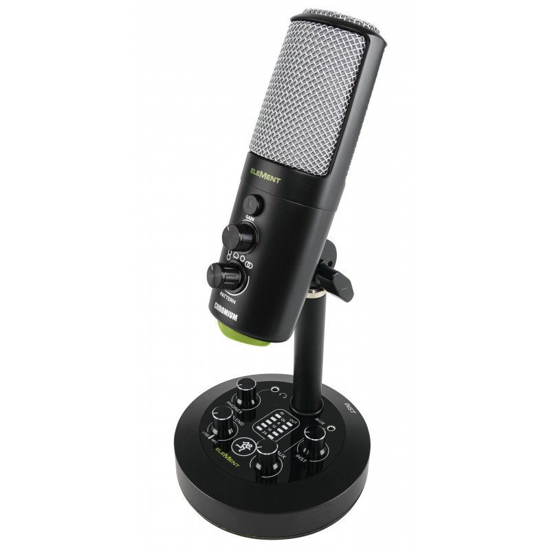 MICROFONE CONDENSADOR DE DIAFRAGMA GRANDE O microfone condensador EleMent Series Premium Chromium USB oferece qualidade profissional e versatilidade incrível em um design tudo-em-um para músicos modernos, criadores de conteúdo, cantores e compositores e muito mais. Integrado diretamente no suporte, o mixer de 2 canais inclui entradas estéreo e de instrumento de 1/8” e possui controles de ganho, mudo e monitoramento de fone de ouvido, além de medição profissional e controle de mixagem. Com 4 padrões polares selecionáveis, o Chromium pode ser otimizado para vocais, ambientes, estéreo, entrevistas entre duas pessoas e muito mais. O lendário circuito de pré-amplificador de microfone Onyx fornece som cristalino e ruído ultrabaixo. Grave rapidamente com os softwares profissionais Pro Tools® First e Waveform™. Plug&Play, Microfone condensador,