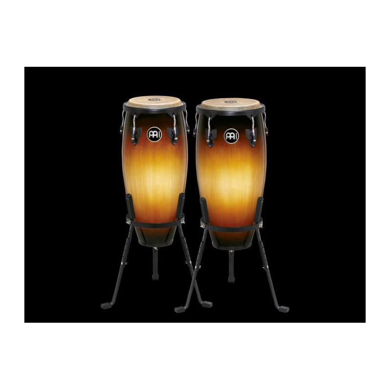 CONGAS 'Conjunto de congas 10' 'e 11' '. Acabamento Sunburst vintage. Com os capacetes de carvalho Siam e os adesivos MEINL True Skin Buffalo, esse par de congas se torna uma opção ideal para estudantes e percussionistas com mais de um conjunto. As peles que montam os patches são selecionadas manualmente por especialistas. Os aros '' Safe Sound '' oferecem batidas ergonômicas ao tocar.