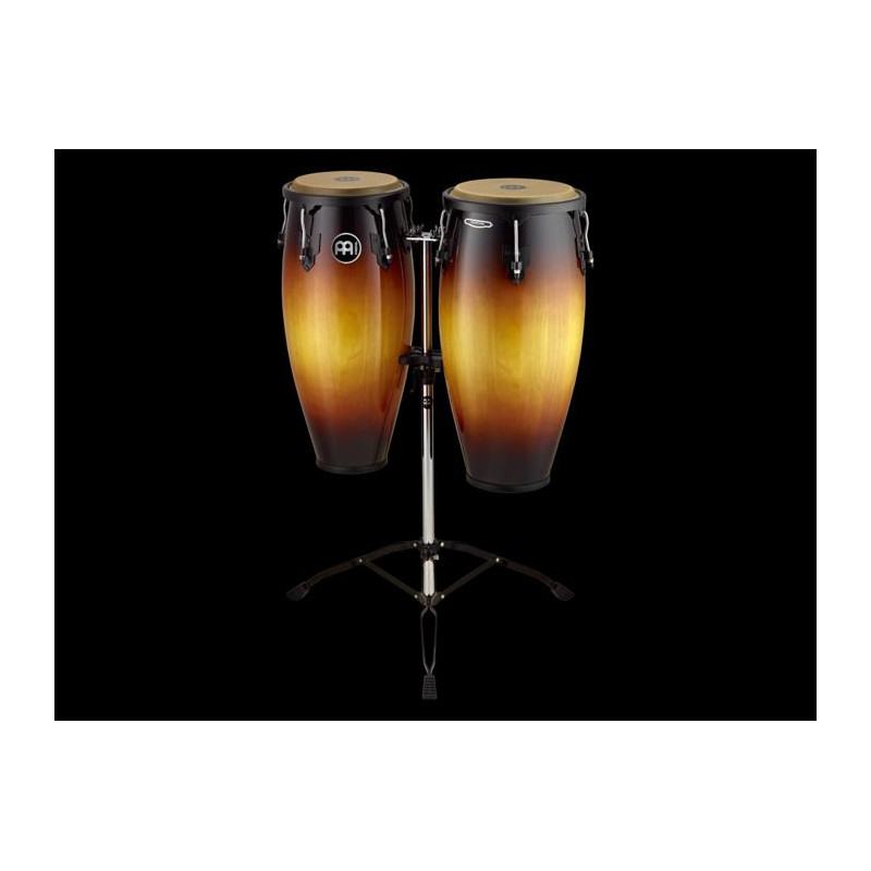 CONGAS 'Conjunto de congas 10' 'e 11' '. Acabamento Sunburst vintage. Com os capacetes de carvalho Siam e os adesivos MEINL True Skin Buffalo, esse par de congas se torna uma opção ideal para estudantes e percussionistas com mais de um conjunto. As peles que montam os patches são selecionadas manualmente por especialistas. Os aros '' Safe Sound '' oferecem batidas ergonômicas ao tocar.