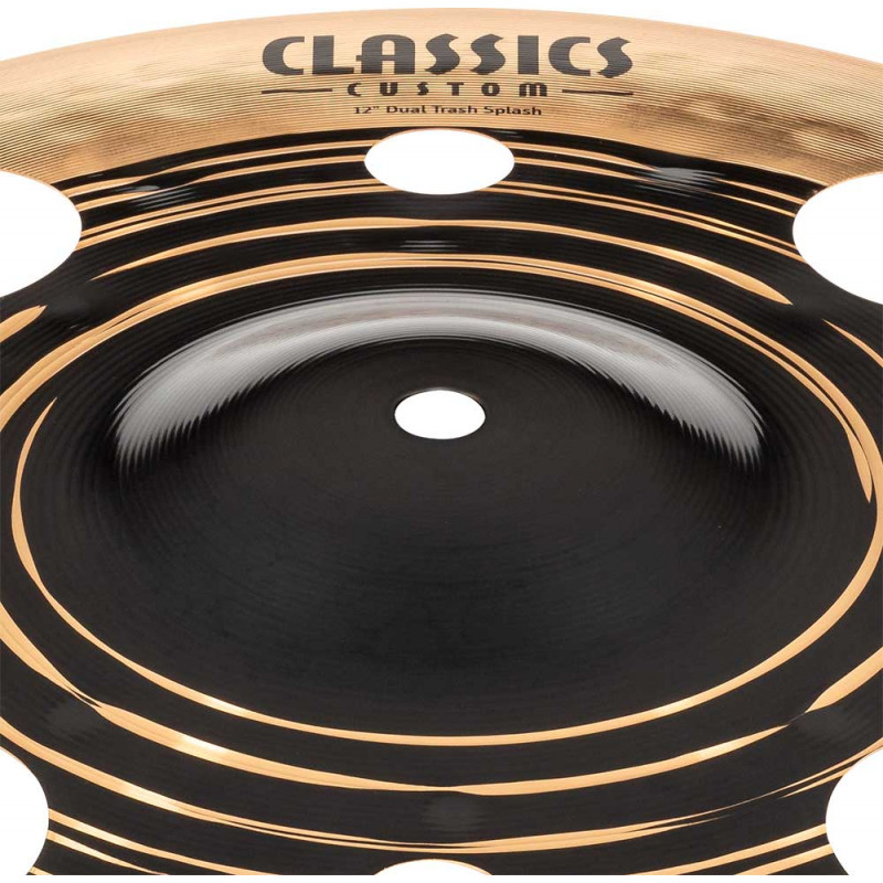 PLACA SPLASH 'Classics Custom Dual 12'' Trash Splash. Os novos Classics Custom Dual têm uma presença espetacular. Mas a sua proposta sólida é ainda mais. Baseado em um tom quente, a borda externa torneada e polida faz com que tenha um toque flexível e também uma resposta rápida ao bater neles. Além disso, a parte central escura faz com que mantenha um caráter explosivo e poderoso. As placas são fabricadas na Alemanha em liga B12. Também achamos importante ressaltar que são feitos 100% com energia renovável e produzidos por nós mesmos.