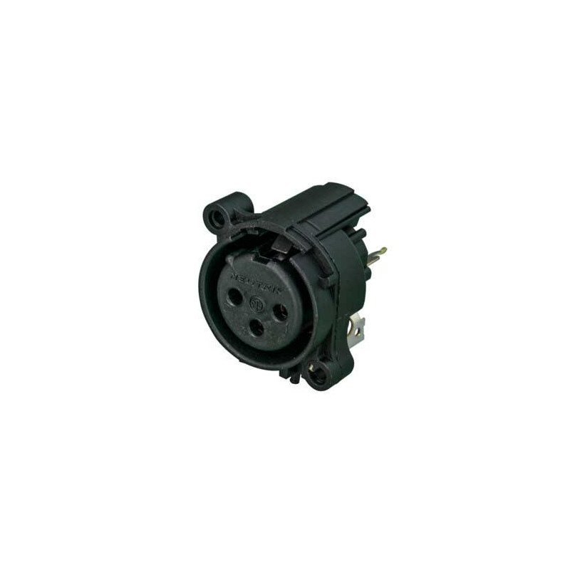 'Receptáculo fêmea XLR de 3 pólos, alojamento do conector correspondente ao pino 1 e painel frontal, montagem vertical na placa de circuito impresso, mola de retenção em vez de trava. O receptáculo ''de última geração''. Conector de painel XLR montado em PCB de corpo redondo de plástico. Eles têm o menor tamanho e a maior densidade de embalagem (23 mm de centro a centro). Contatos em forma de tulipa recém-projetados com revestimento de ouro duro e áreas de contato polidas. Componente reconhecido pela UL.'