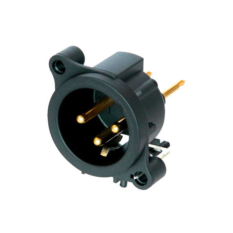'Receptáculo macho XLR de 3 pólos, aterramento: Contato de aterramento separado para caixa do conector e painel frontal, montagem vertical em PCB. Conector de painel de montagem XLR redondo com corpo de plástico mais econômico. Recorte do painel frontal e layout PCB 100% compatível com a série A. Design de contato ''Tulip'' com alta pressão de contato para maior durabilidade. Classificação de inflamabilidade UL94HB. Componente reconhecido pela UL.'