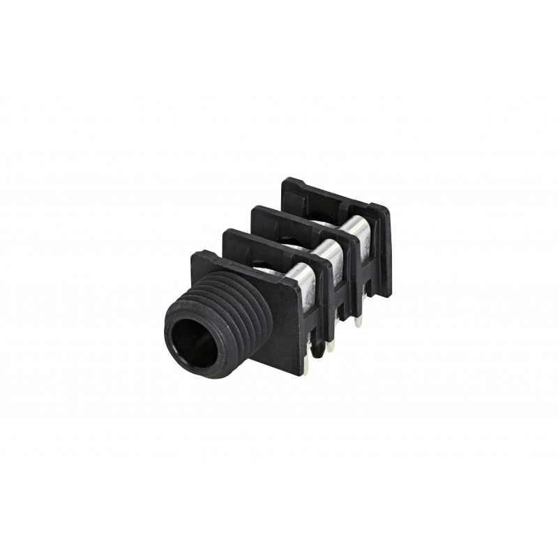 Conector jack estéreo de '1/4'', com interruptor e rosca totalmente rosqueada. Conector de montagem em painel PCB horizontal que oferece alta densidade de empacotamento da placa através da montagem em centros mínimos de 15,88 mm (0,625 polegadas) em fileiras ou matrizes. As ferragens de montagem devem ser encomendadas separadamente.'