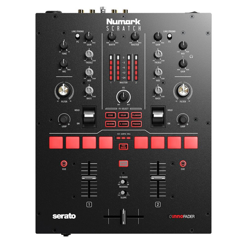 O novo Numark Scratch é um mixer de dois canais com resolução de 24 bits que combina recursos profissionais com uma extensa suíte de software, por um preço surpreendente. Combinando um sólido chassi todo em metal com recursos profissionais, como o crossfader InnoFADER, pads, codificador de loop instantâneo e botões para ativar efeitos baseados em software, o Scratch foi projetado para se impor claramente em mixers de scratch, estabelecendo um novo padrão, com um preço muito acessível. Simplesmente, nenhum outro combina esses recursos, versatilidade, facilidade de uso, qualidade e desempenho. Seis botões de acesso direto a FX por software permitem aceder a uma vasta paleta de efeitos, com controles de tempo e intensidade. Graças ao Instant Loop Encoder, é muito fácil criar loops, encurtá-los para aumentá-los. Pressionar o botão usará os parâmetros predefinidos no software. A qualidade profissional do Scractch é inédita; Com uma impressionante relação sinal-ruído de 108 dB, conectividade baseada em desempenho e som de alta qualidade com resolução de 24 bits, o Scratch garante que você tenha sempre o melhor som. Além disso, está disponível um filtro passa-altas / passa-baixas que não depende do software, para que ele possa funcionar efetivamente com toca-discos analógicos, assim como acontece com os efeitos baseados em software. A unidade também incorpora o fader innoFADER incrivelmente suave. Este crossfader de alta qualidade foi especialmente concebido para o risco, oferecendo uma fiabilidade à prova de balas, o que é perfeito para enfrentar a dureza dos arranhões e a sua utilização continuada. Possui controles de investimento e curva, que permitem a adaptação a qualquer forma de uso. O Scratch inclui a versão completa do Serato DJ Pro e o pacote completo de expansão DVS (seu valor é 99?). O DVS Expansion Pack permite conectar imediatamente toca-discos ou tocadores de CD / mídia e controlar o Serato DJ Pro usando vinil ou CD NoisemapT Control. Com a licença Serato DJ Pro inclusa, você pode conectar qualquer driver especializado, como o Numark NDX500, para que você possa aproveitar o equipamento mais completo. Quatro pads de interpretação oferecem disparo por pontos, loops para construções criativas e controle de amostras; Isso é algo sem precedentes nesta faixa de preço. Em cada canal existem controles para acesso direto aos loops de software, o que torna mais fácil para o DJ desenvolver toda a sua criatividade. O Scratch tem tudo o que é necessário para enfrentar qualquer situação. Possui saídas principais através de XLR, uma saída não balanceada para entrada de linha não balanceada / entrada phono, microfone / entrada auxiliar com conexões XLR e ¼ "e controle específico para o nível do microfone.