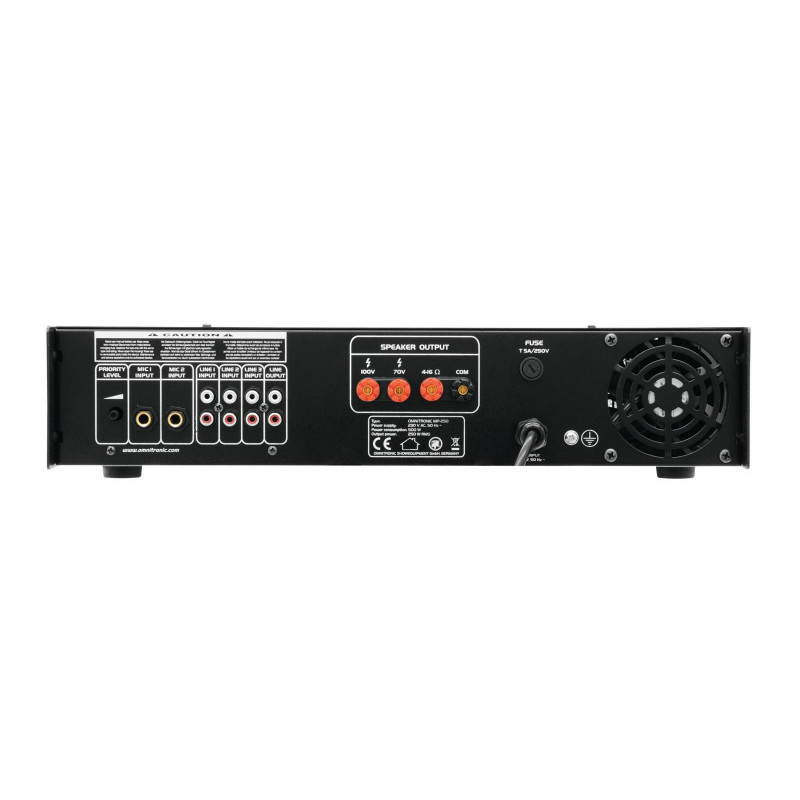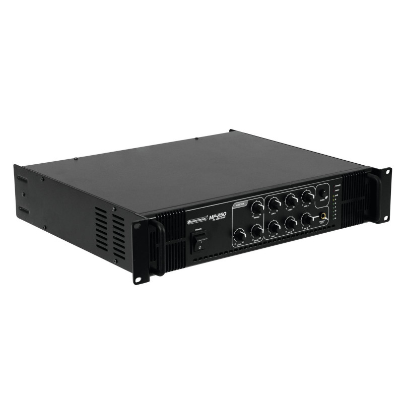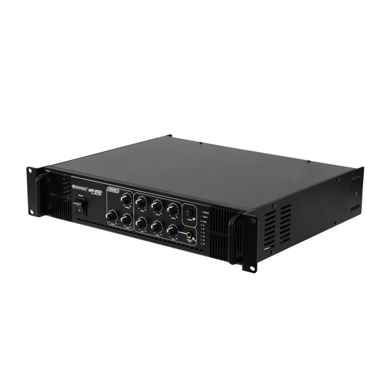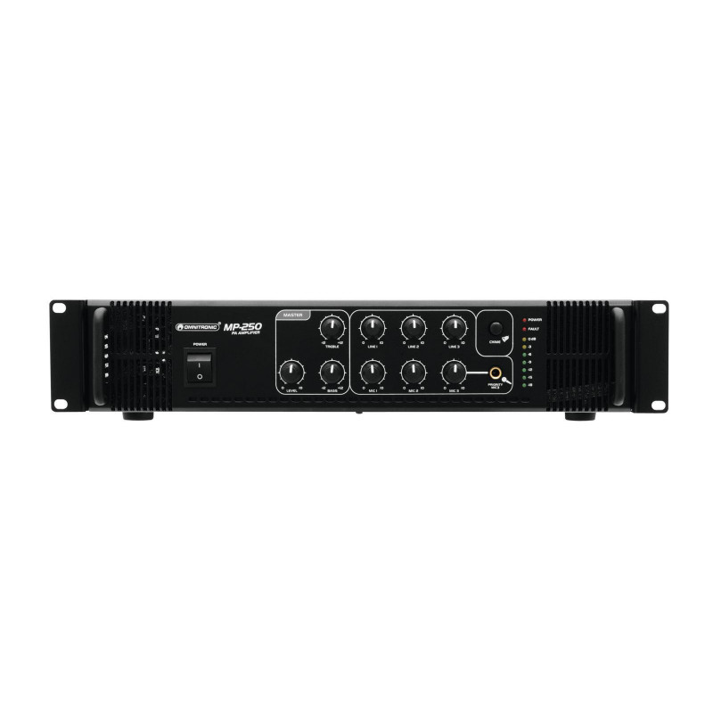 Alta confiabilidade com o máximo de flexibilidade O amplificador de mixagem Omnitronic MP-250 ELA é seu parceiro confiável ao trabalhar com sistemas de som ELA. Graças ao seu formato de 19 ", é ideal para instalações móveis e fixas. As saídas para alto-falantes ELA com transformadores de áudio de 70 V e 100 V ou alto-falantes de 4-16 ohms não deixam nada a desejar. Além disso, você também pode conectar um dispositivo com nível de linha (por exemplo, console de mixagem) à saída de linha. Com 6 entradas mixáveis, você sempre fica flexível. Conecte até 3 microfones e 3 dispositivos de nível de linha. Os anúncios são uma prioridade A entrada de microfone 3 no painel frontal oferece um circuito de prioridade ajustável Permite fazer anúncios importantes com redução de nível automática e continuamente ajustável de todos os sinais. Use o gongo para destacar seu anúncio. Recursos de proteção Um ventilador protege o interior do seu MP-250 de superaquecimento. com atraso, possui circuitos de proteção contra sobretensão e curto-circuito.Nesses casos, os alto-falantes são eletricamente isolados do amplificador.O LED FAULT acende e os MP-250 e seus alto-falantes estão protegidos contra danos.