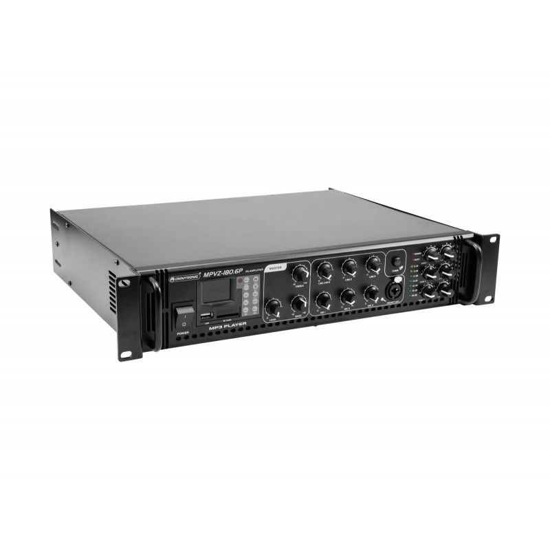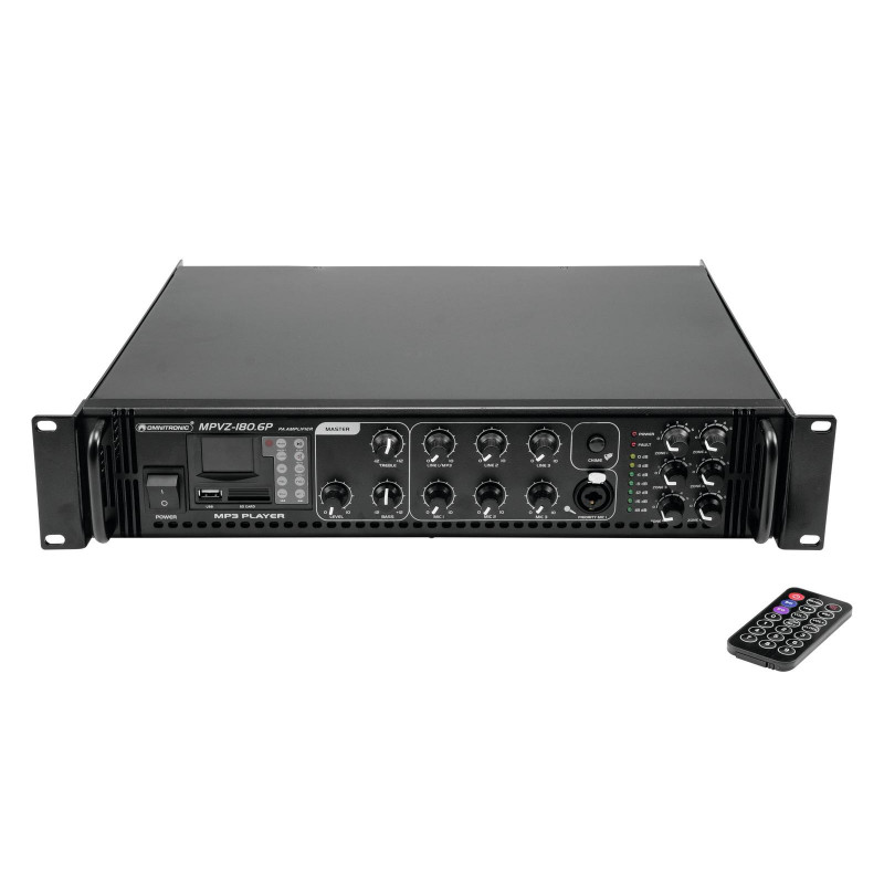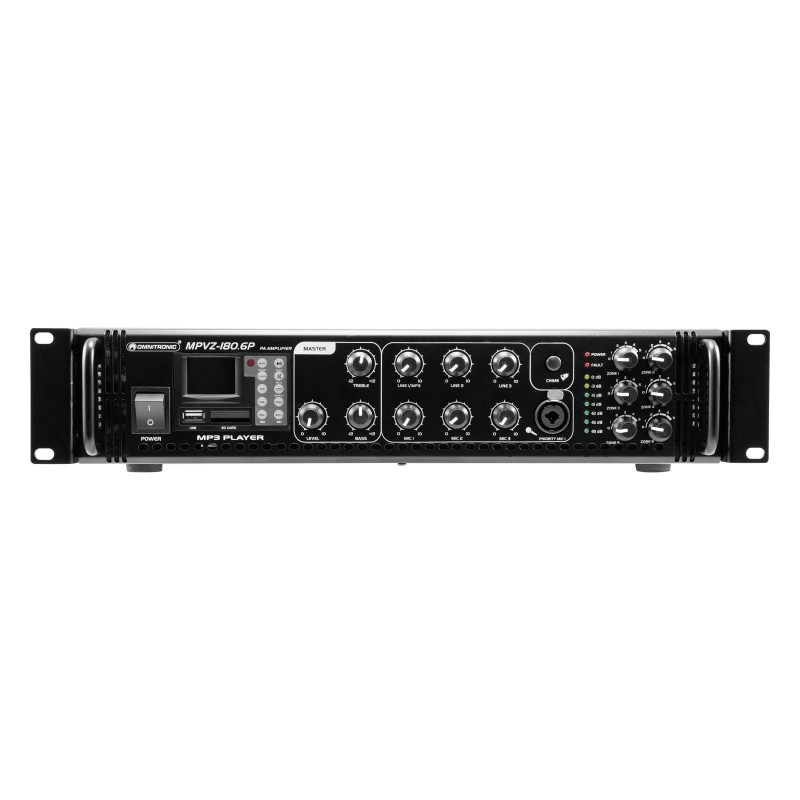 Confiabilidade enorme com o máximo de flexibilidade O amplificador de mixagem Omnitronic MPVZ-180.6P ELA é seu parceiro confiável para sistemas de reforço de som ELA. Graças ao seu formato de 19 ", é ideal para instalações móveis e permanentes. As saídas para alto-falantes ELA com transformadores de áudio de 70 V e 100 V ou alto-falantes 4-16 Ohm não deixam nada a desejar. Além disso, você também pode conectar um dispositivo com nível de linha (por exemplo, console de mixagem) à saída de linha.Você é sempre flexível com 6 entradas mixáveis. Conecte até 3 microfones e 3 dispositivos de nível de linha. Controle seus alto-falantes ELA de forma conveniente através das 6 saídas de zona do MPVZ-180.6P São ajustáveis separadamente no painel frontal com um controle de volume de 5 estágios. Para você, isso significa a maior adaptabilidade possível ao implementar o seu conceito de reforço de som.O MPZ-180.6P também oferece um MP3 player com controle remoto infravermelho e azul. Possui um slot para cartão SD e uma porta USB. Assim, você pode reproduzir de forma espontânea e flexível os títulos das músicas de um meio de armazenamento de sua escolha.Faça você ouvir! A entrada de microfone 3 no painel frontal possui um preço ajustável. interruptor de oridade. Permite fazer anúncios importantes com redução de nível automática e continuamente ajustável de todos os sinais. Use o gongo para chamar mais atenção ao seu anúncio. ProteçãoUm ventilador protege o interior do seu MPVZ-180.6P contra superaquecimento. Além de um atraso na ativação, possui circuitos de proteção contra sobretensão e curto-circuito. Nesses casos, seus alto-falantes são eletricamente isolados do amplificador. Isso protege o MPVZ-180.6P e seus alto-falantes contra danos.