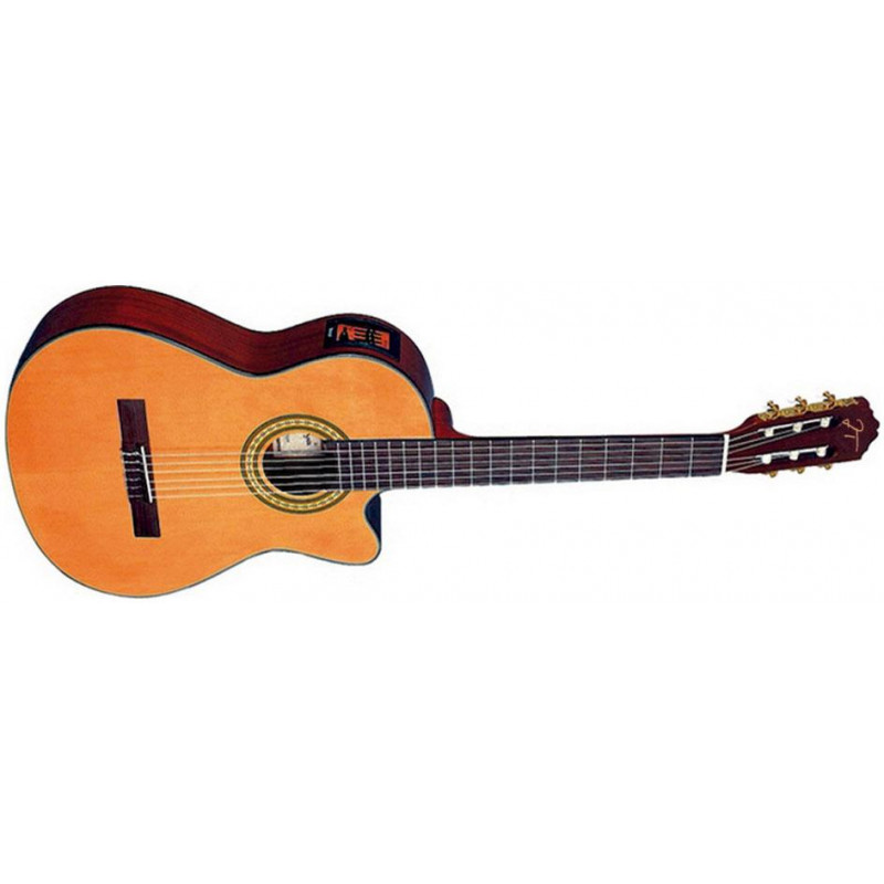 GUITARRA CLÁSSICA COM ANTERIOR Guitarra eletrificada cortante clássica. Tampo em abeto. Basswood costas e lados. Mastro de Catalpa. Fingerboard e ponte de 'pau-rosa composto'. Cabeçote de ouro. Borda de 5 camadas. Pré-amplificador ativo EQ7545 com volume, controle de presença e EQ de 3 bandas.