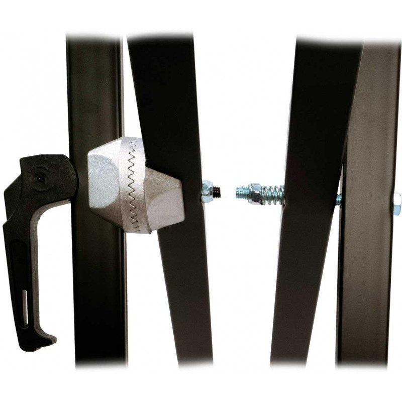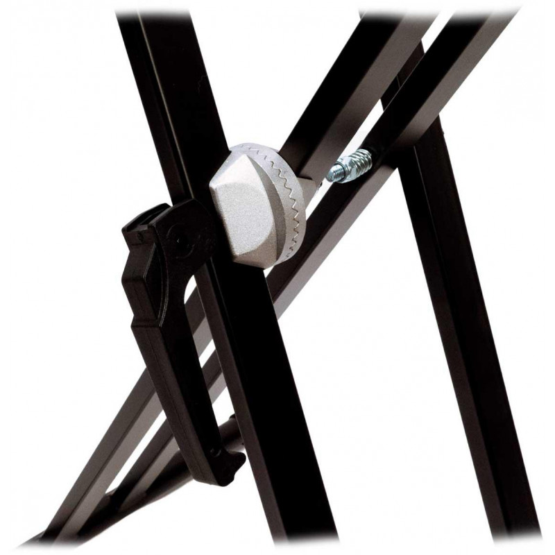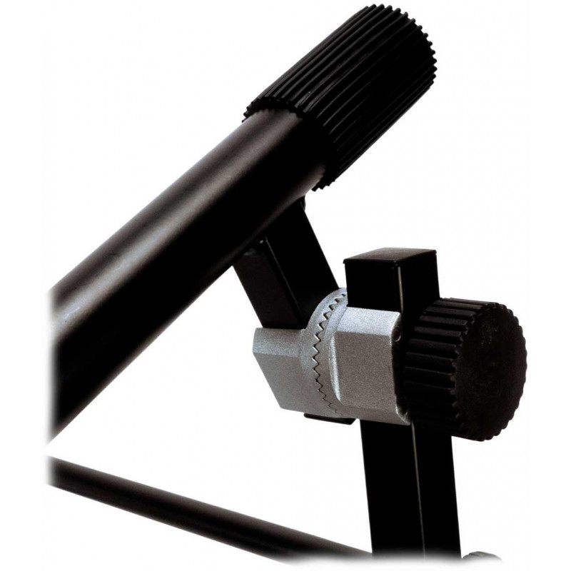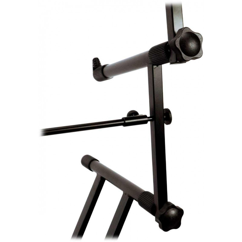 SUPORTE PARA TECLADOS MÚLTIPLOS Suporte de teclado profissional de três níveis com sistema de ajuste rápido. Pernas de perfil duplo e acabamento preto. Altura mínima: 560mm. Altura máxima 970mm. Profundidade do primeiro nível 400 mm. Profundidade dos níveis 2 e 3 330 mm. Seção horizontal do tubo: 28 mm. Seção vertical do tubo: 25 x 25 mm. Peso 11,80kg. Carga máxima 90 kg.