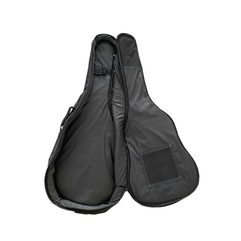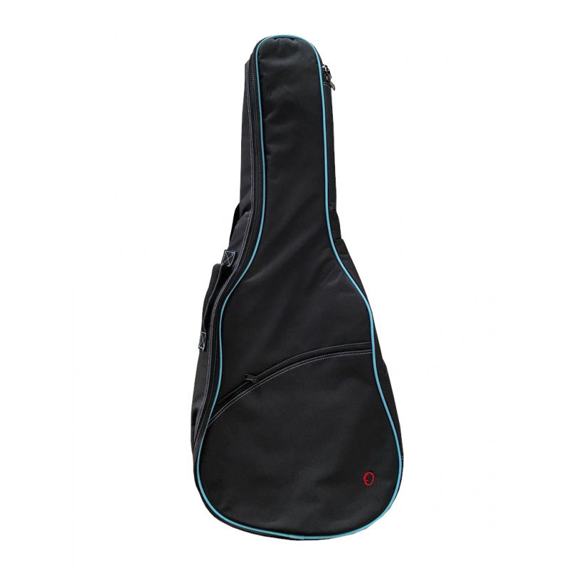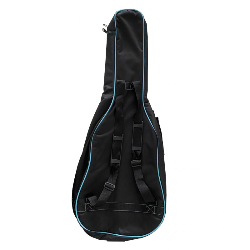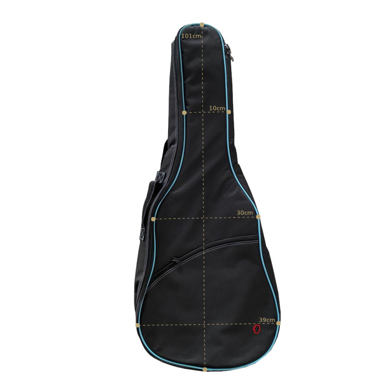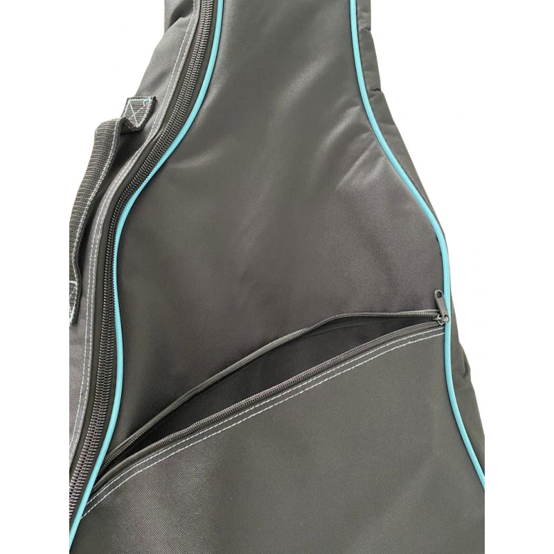 Capa para guitarras clássicas acabadas composta inteiramente de poliéster na cor preta com algumas em turquesa, o zíper lateral se estende por todo o lado direito resultando em uma abertura confortável para facilitar o armazenamento do instrumento, possui 2 alças que permitem o uso de Para o cofre armazenamento do instrumento, possui também um bolso frontal amplo com zíper para guardar partituras. Ele também tem uma alça confortável no lado esquerdo para carregá-lo na mão.
