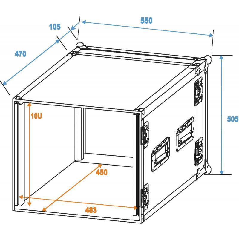- Trilhos de perfil com instalação de 10 U para unidades de 483 mm (19 "), por exemplo, amplificadores PA, fontes de alimentação, equipamento adicional