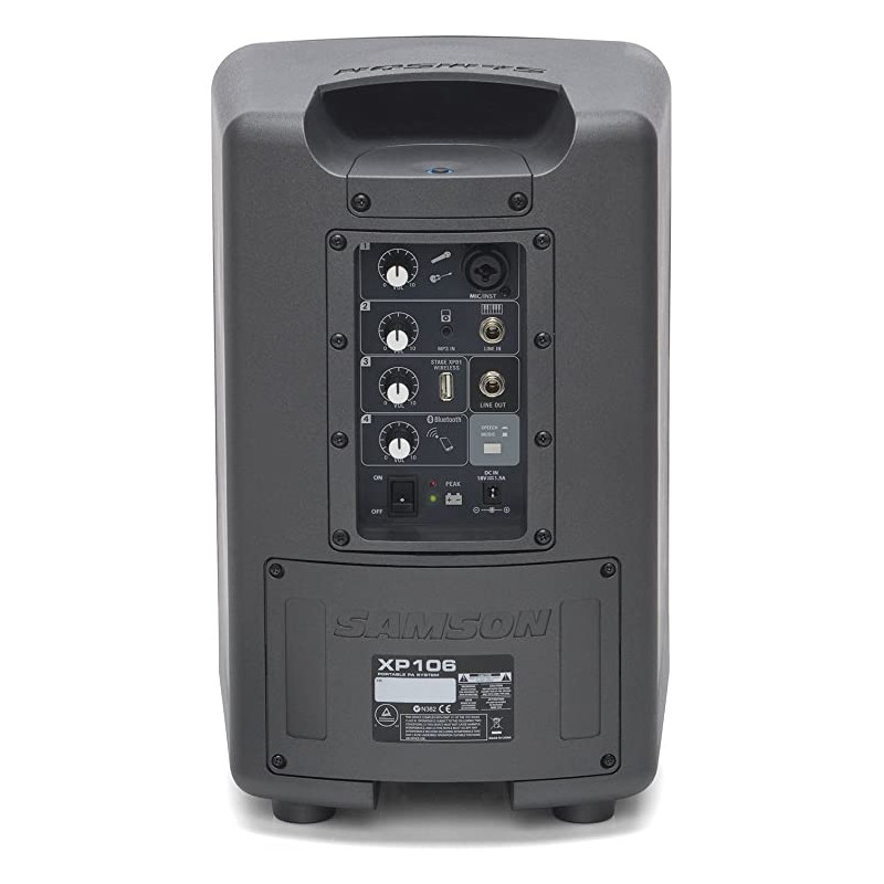 ALTO-FALANTE COM BATERIA RECARREGÁVEL Caixa portátil compacta autoalimentada de 100 W de 2 vias. 1x6'' e 1x1''. Possui um mixer com 1 canal de microfone/linha (Combo), 1 canal de linha estéreo (1/4' Jack, 1/8' Jack), 1 canal Bluetooth. Microfone incluído. Bateria recarregável (autonomia de uso contínuo de 20h). Entrada USB para sistema de microfone sem fio Samson XPD (não incluído). Ideal para pequenas apresentações. Cor preta.