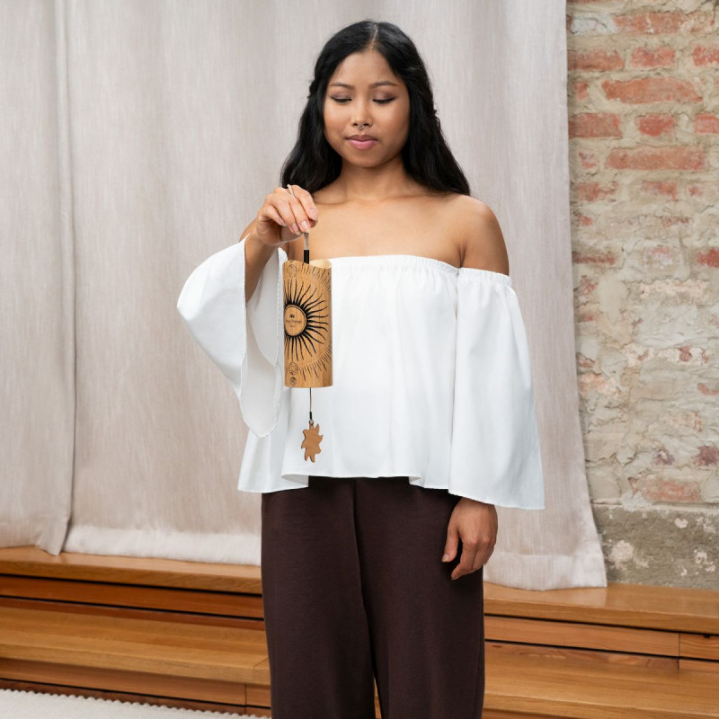 EFEITOS SONOROS 'Meinl Sonic Energy Cosmic Bamboo Chimes produzem tons suaves e ressonantes que preenchem seu espaço com um som sereno. Use-o para meditação, banhos sonoros e ioga. Ou crie um espaço relaxante em casa para refletir. Segure o fio e gire suavemente a campainha para ativar o som. Dentro há um pêndulo e um grupo de dentes de metal ajustados em tons específicos. Modifique facilmente o tom alternando entre os dois pêndulos: acrílico (duro) e madeira (macio). Insira a extremidade do fecho do pêndulo na parte inferior dos sinos. Prenda o fecho no gancho da barra transversal de madeira. Puxe o cordão trançado em linha reta e junte-o para tocar os sinos. Disponível em quatro afinações adaptadas à hora do dia: Aurora (manhã), Sol (dia), Lua (tarde) e Stella (noite). Combine dois ou mais para criar contraste de clima. Cada carrilhão vem com dois pêndulos de reposição adicionais (acrílico, madeira). Tons suaves e ressonantes, Para meditação, banhos sonoros e ioga, Ajustados para se adequar à hora do dia, Alça de pulso para fácil manuseio. Tamanhos 2,6''/6,5cm de diâmetro, 17''/43cm de altura