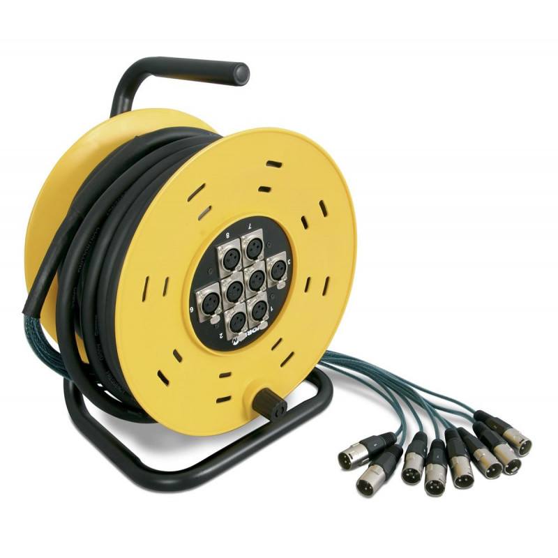 Carro con manguera que dispone de tambor de gran capacidad y una estructura metálica para facilitar tanto su transporte como apoyo en el suelo. El conexionado desde el carro se realiza mediante un panel con conectores XLR 3 pines.