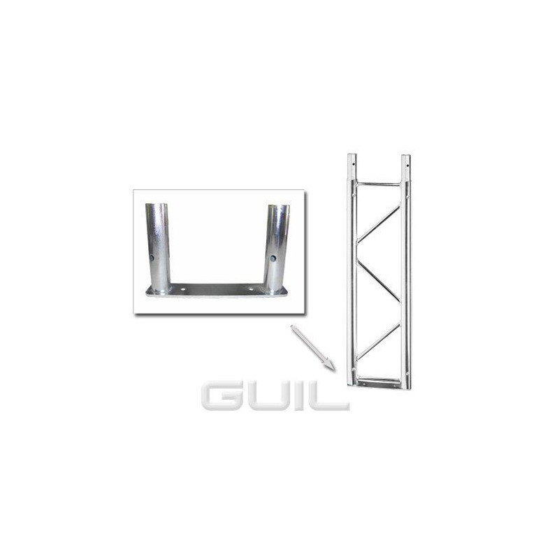 La base de 310 mm x 60 mm está provista de dos tubos adaptadores de 150 mm donde se fijan los trusses paralelos TP300; añadiendo una altura extra de 2 cm respecto a la del truss colocado.